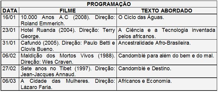 A Sociedade de Preservação do Axé Bangboxé, entidade sem fins lucrativos, mantenedora das Instituições: Terreiro Lajuomin e Ilê Odô Ojê (Terreiro Pilão de Prata) na ocasião do seu Ciclo de Festas, vai realizar de 16 de janeiro a 06 de março, a I Mostra de Filmes, seguida de debates com a comunidade. O objetivo dos seis encontros é mobilizar a comunidade a refletir questões específicas como história, alimentação, cultura e religião, além de aspectos relacionados à identidade, direitos humanos e cidadania. O evento contará com o apoio da Escola de Nutrição da Universidade Federal da Bahia e terá a participação do professor Dr. Vilson Caetano Júnior. A Sociedade de Preservação do Axé Bangboxé localiza-se na Rua Thomaz Gonzaga, 298 – Alto do Caxundé – Boca do Rio.