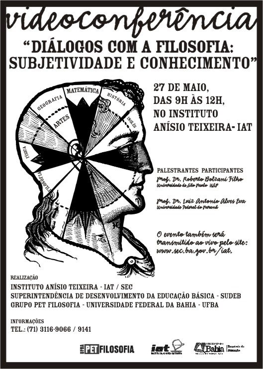 O PET (programa de educação tutorial) junto a Secretaria Estadual da Educação, através do Instituto Anísio Teixeira - IAT e da Superintendência de Desenvolvimento da Educação Básica – SUDEB, promove a terceira videoconferência da série DIÁLOGOS COM A FILOSOFIA, no dia 27 de Maio (terça-feira), de 9h às 12h, desta vez com o tema: CONHECIMENTO E SUBJETIVIDADE. Nossos palestrantes convidados, os professores Luiz Eva (UFPA) e Roberto Bolzani (USP), são dois dos maiores especialistas do Brasil com inúmeras publicações relevantes sobre o tema. Todos são convidados e poderão frequentar, gratuitamente, qualquer uma das 40 salas de videoconferência da Rede Educação em todo estado ou assistir ao vivo pela internet no endereço www.sec.ba.gov.br , participando por e-mail. |